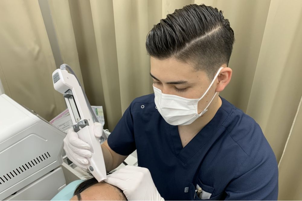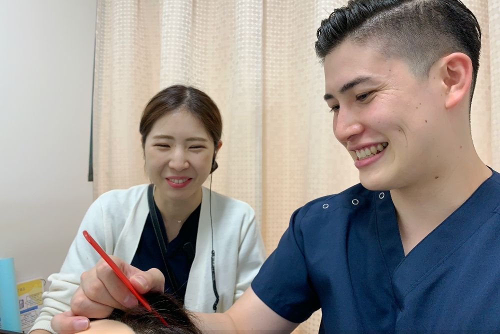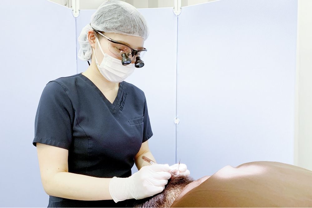 薄毛治療・自毛植毛を行うAGA専門クリニックのため、毛束(グラフト)、採取介助、植毛、毛髪再生メソセラピー(薄毛部位に発毛育毛に必要な成分を浸透させる)の施術などを行います。また、そこで使用する医療器具の消毒・管理を行います。